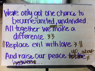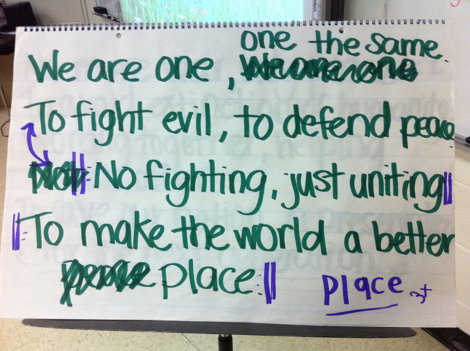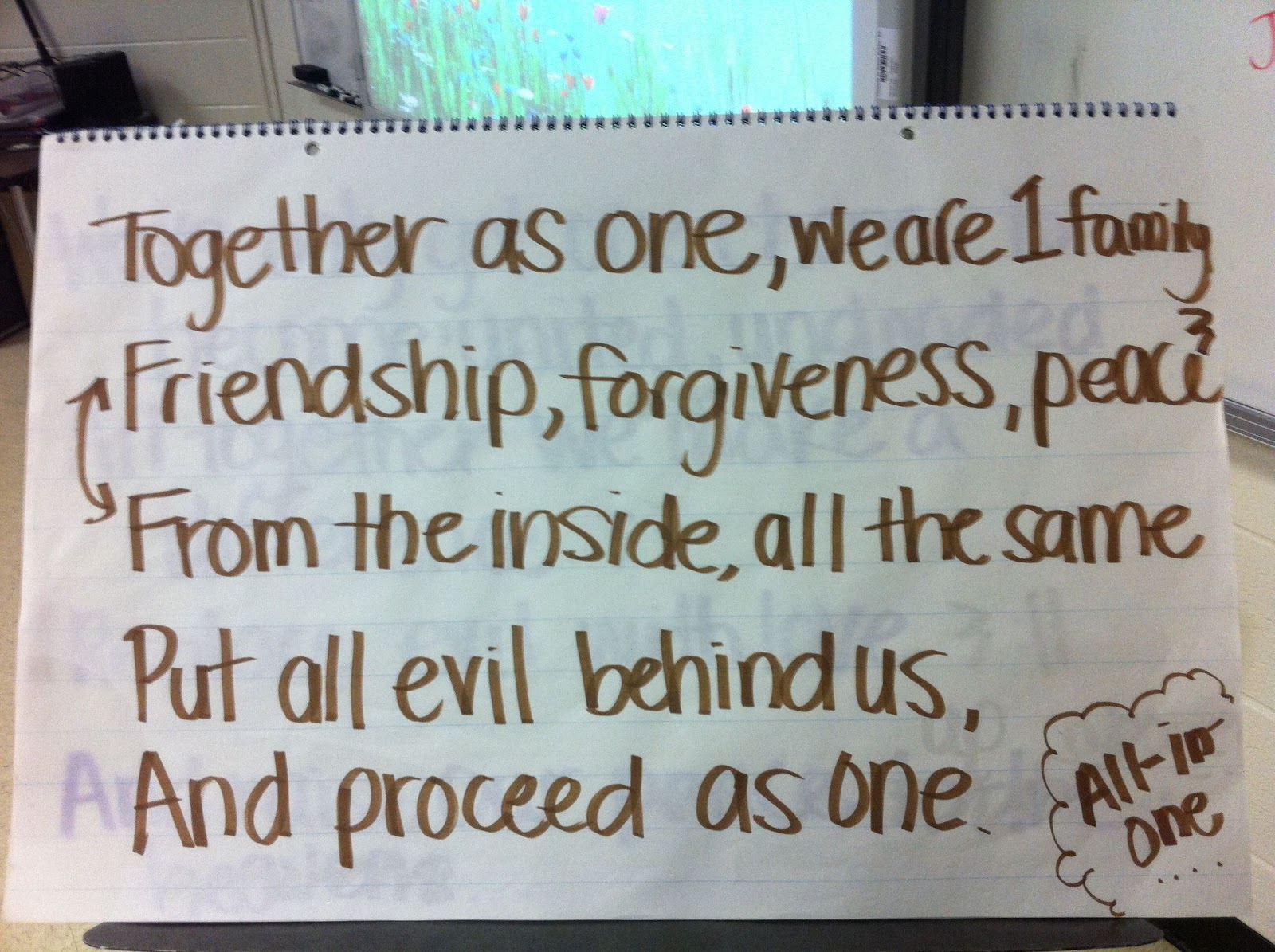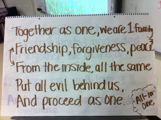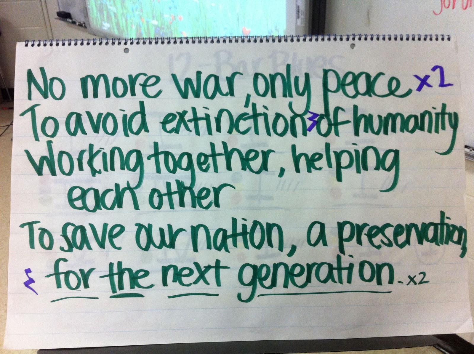 The development of the Black Eyed Peas Project was an amazing process to witness. Today I will share with you our process of writing the poetry that became the lyrics to our song. Below are some of the chart pages we worked with while brainstorming and writing. (Note: I do almost everything digitally in my classroom so this was a total departure for me using markers and chart paper…I chose this medium though because we needed to be mobile for when it came time to record our compositions).