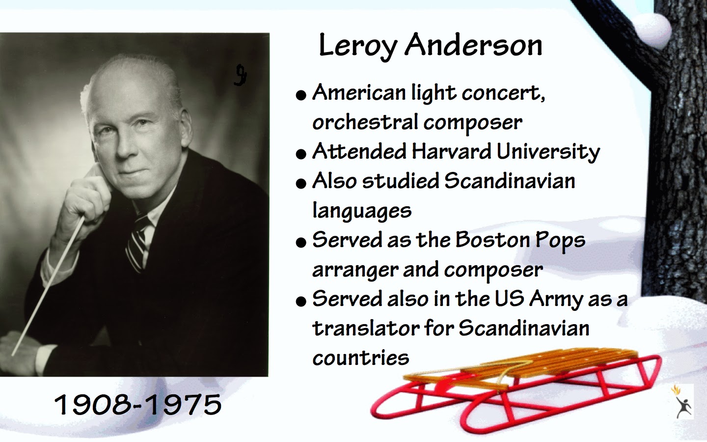 And we “popcorn read” the bulleted points, as I expound upon Mr. Anderson’s life. A great resource is Leroy Anderson’s official website, so I add extra little bits of info, like what exactly is the Boston Pops or where is Harvand. Then its time for the next slide…