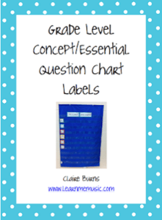 I want to share with you my classroom Essential Questions and Concept display system.  I have a blue pocket chart mounted on the wall by my door.  I made these cute labels to denote each grade level’s essential question or concept for the week.  I use sentence strips to write out what we’re doing to post there.  I like having it by my door because it is a good visual for students on their way in to my room, a good indicator to my administrators of the value of what we’re learning in music, and a good assessment tool as we line up to review what we’ve covered in class.