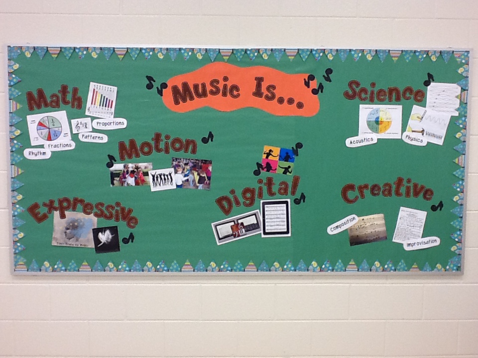 Since I work at a STEM Academy, I always try to emphasize how music also involves math and science, as well as now in the 21st century, utilizes technology in a major way. This bulletin board summarizes my classes perfectly!