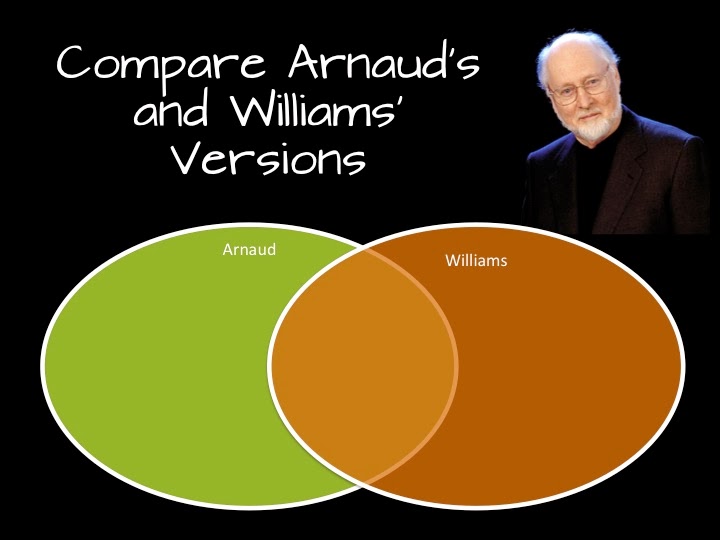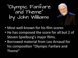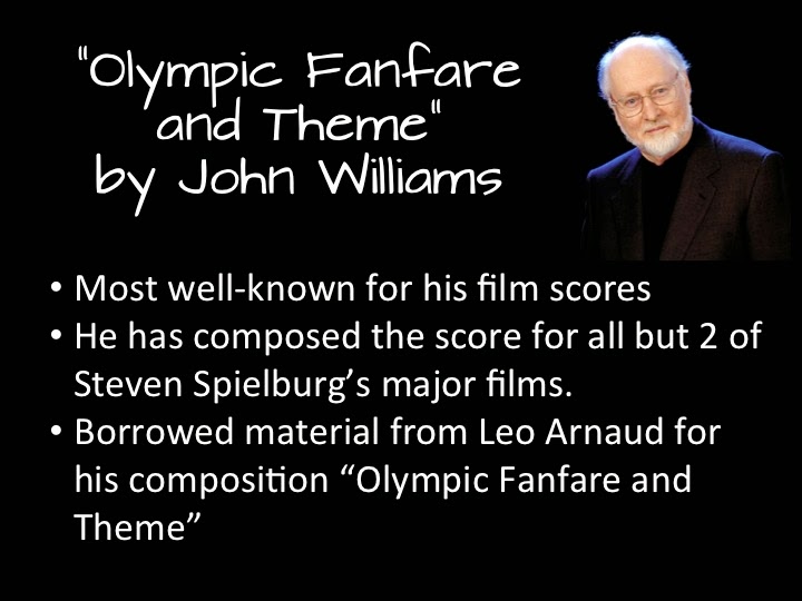 album for the 1996 Atlanta Games. That’s why the two pieces sound almost the same; however, Williams’ piece is obviously more complex and more orchestral and thematic. I prefer for music class to use Arnaud’s version because the form is more accessible. Anyway, we listen to the two versions.