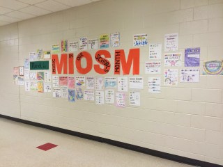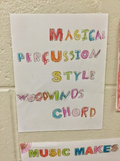 I traced some large letters for “MIOSM” on butcher paper (TIP: If you’re not an all-star freehand letter drawer, no worries! Project a word document using a projector onto your board, covered with some butchers paper, and trace!! Perfect letters everytime!). Then I hand wrote the words “Music In Our Schools Month” on each letter, cut out, and laminated.