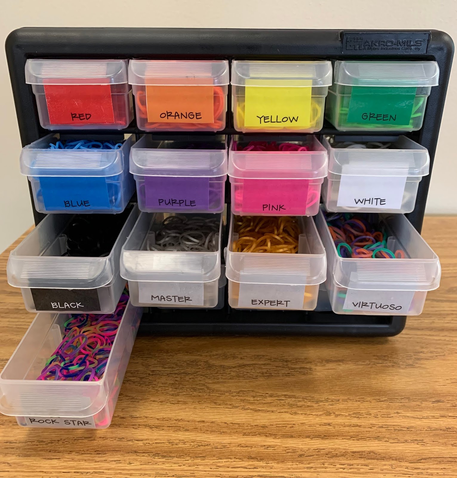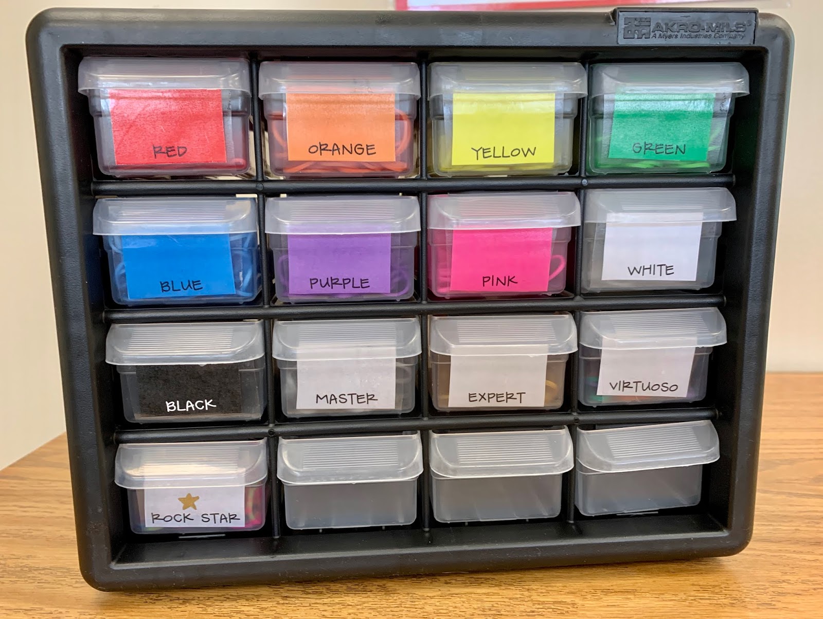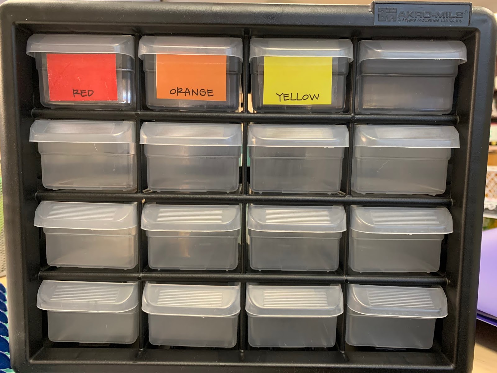 To keep them organized, I used a small 16-drawer tool box organizer meant for small notions or hardware. Here is the link to the one I ordered on Amazon….